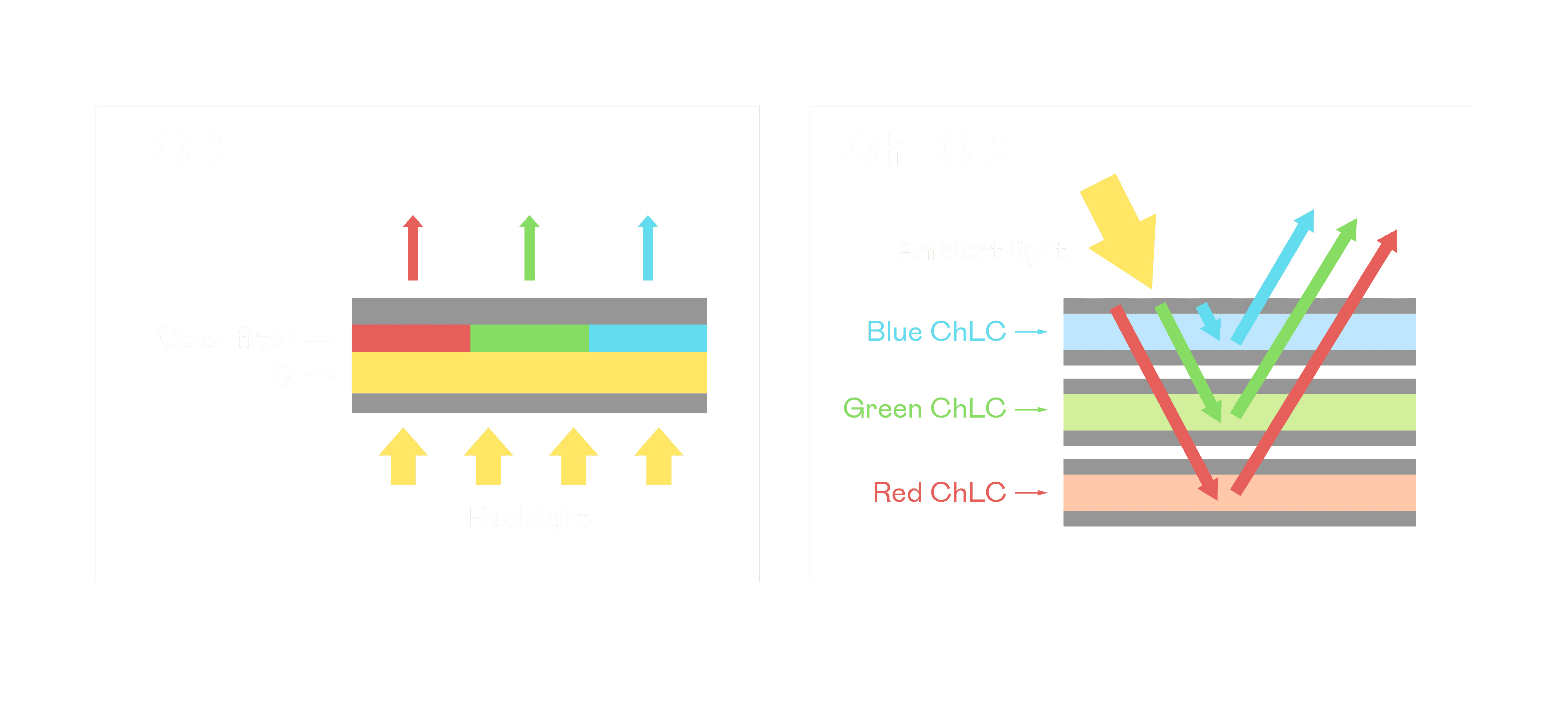 ChLCD 胆固醇液晶就如同纸张一样,,,,透过反射环境光来显示影像,,,因此长时间观看不易造成人眼视觉疲劳,,,可达到护眼效果。。。当处于户外阳光下使用,,LCD 影像容易失真而不易观看,,,但胆固醇液晶仍可维持较佳的影像品质。。。