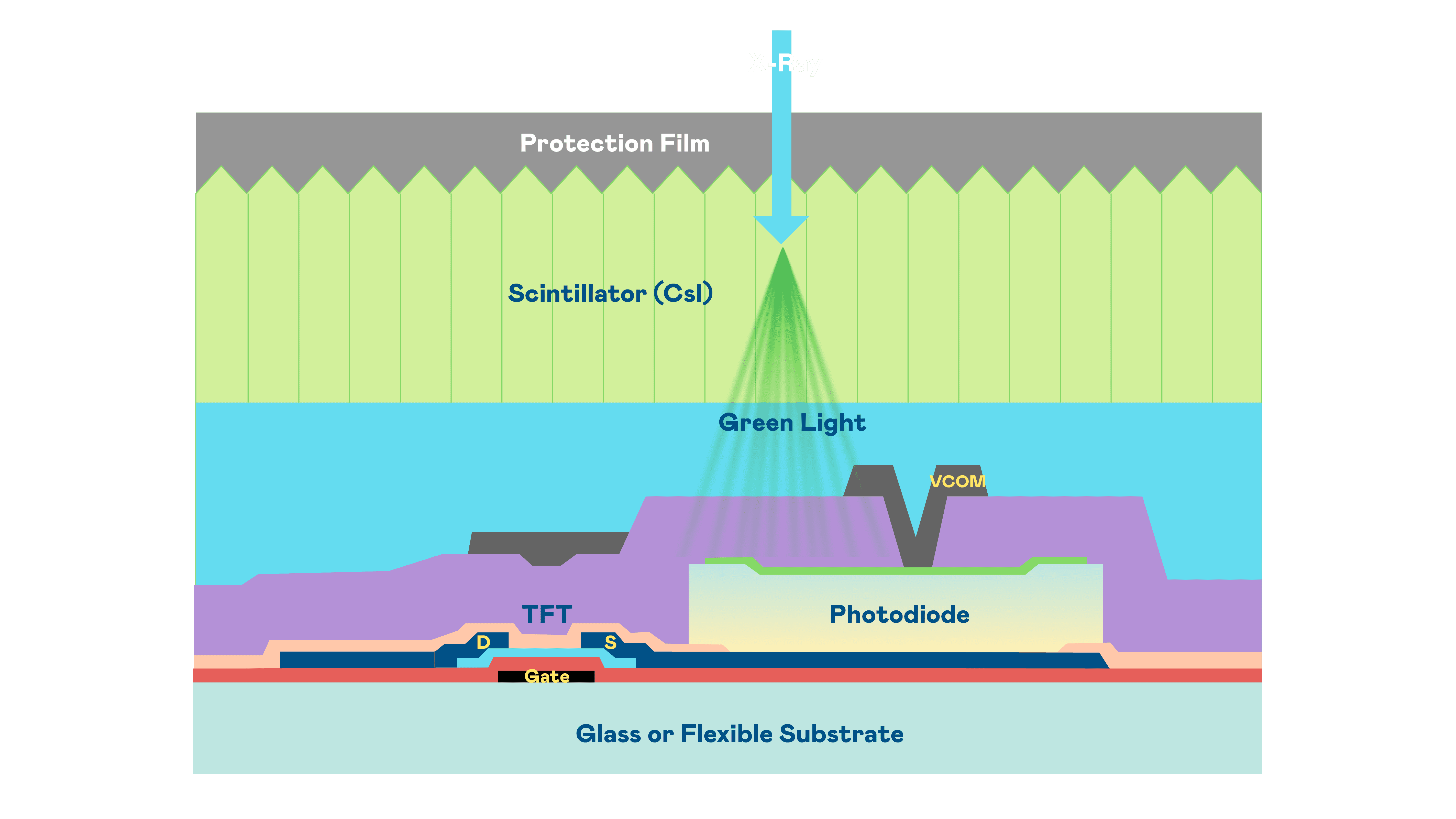 918.COM的X光影像感测阵列使用薄膜电晶体 (TFT) 作为每个像素的读取开关,,,,搭配光电二极体(Photodiode)的光电转换元件,,,,用以感测X光影像讯号。。。